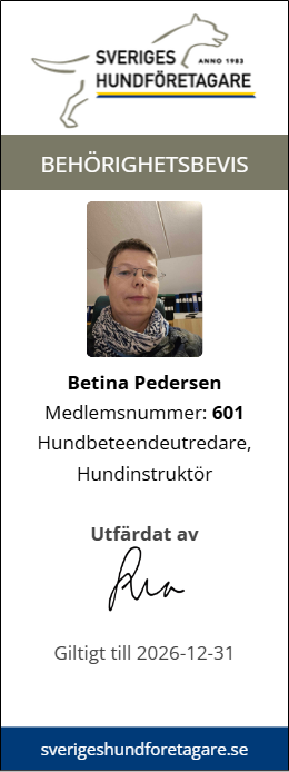 Betina heter jag och är utbildad som hundinstruktör och hundbeteendeutredare genom Hundsteg och har tagit fler kurser och webinar för att utveckla mig inom hundpsykologin och som hundtränare. Året 2023 blev jag diplomerad friskvårdkonsulent med D9, akupunktur, friskvård/ fys-träning med hund och hundmassage.